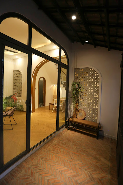 Do diện tích nhà nhỏ và gia chủ là gia đình trẻ nên nhóm KTS chọn vật liệu gỗ mộc mạc và tông màu vàng để tạo cảm giác ấm cúng, gần gũi và thân thiện. Mặt tiền phía trên lầu khá cũ nên KTS đã thay toàn bộ cửa thành hệ cửa nhôm xingfa vòm màu xám. Thêm vào đó, bức tường trắng được tạo điểm nhấn khác lạ bằng đường viền làm từ gạch nung cổ đỏ có phủ 3 lớp keo trong để chống rêu mốc.