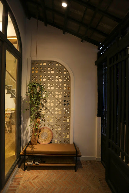 Gia chủ dành một khoảng sân nhỏ phía trước để phục vụ cho việc để xe. Theo hiện trạng cũ, phòng khách và phòng bếp đều có cửa mở kết nối ra khu vực này để thông thoáng. Nhưng KTS nhận thấy thiết kế cửa ra vào cho phòng bếp như vậy chưa thực sự hợp lý nên đã bít lối đi đó lại. Thay vào đó, một vách tường thoáng với hệ gạch thông gió sơn xám được thiết kế, vừa giúp tiết kiệm diện tích cho phòng bếp vừa tạo thêm một góc công năng mới - nơi gia chủ có thể cất giày dép thuận tiện hàng ngày.